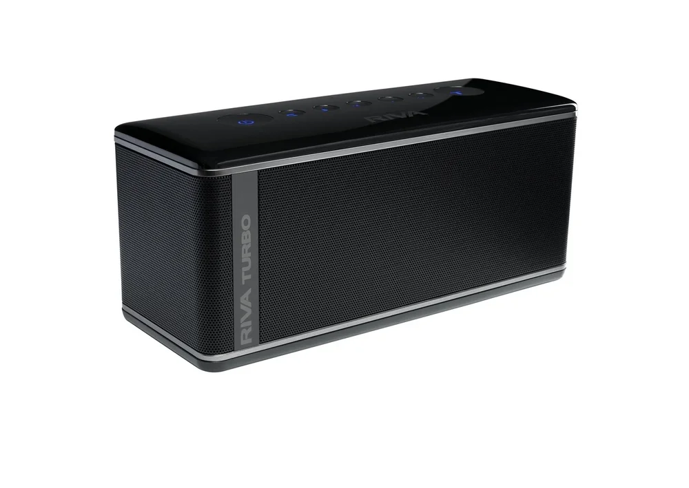 The Riva Turbo X is a high-performance portable Bluetooth speaker known for its powerful, room-filling sound and premium features. It uses proprietary audio technologies like ADX Trillium to create expansive sound and can reach up to 100dB when its "TURBO EQ" mode is activated. Key features include a 26+ hour battery life, USB charging for other devices, a built-in speakerphone with noise cancellation, and both wireless (Bluetooth aptX) and wired connectivity options. It is designed to be both portable and durable, with a sleek design and touch-sensitive controls.